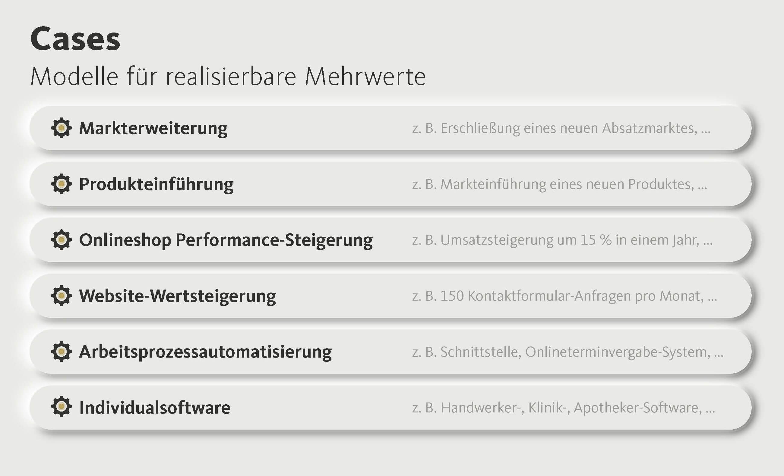 Die Möglichkeiten sind zahlreich. Wir können zusätzliche Märkte ansprechen, neue Produkte einführen, die Performance von Online-Shops oder den Website-Wert steigern, Arbeitsprozesse optimieren oder individuelle Software passgenau entwickeln.
