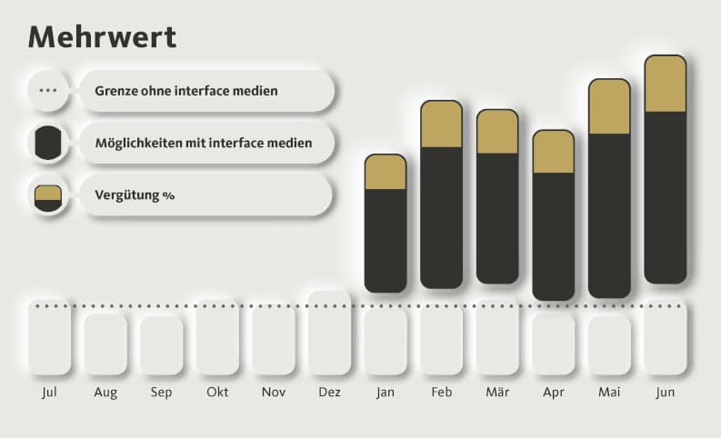 Bezahlt wird nur, wenn es funktioniert! Wir erhalten also einen Anteil vom erreichten Mehrwert, den Sie zusätzlich mit uns verdient haben – eben erfolgsbasiert. Weil wir überzeugt davon sind, dass wir gemeinsam diesen Mehrwert auch erreichen.